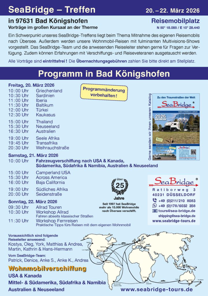 Außerdem werden die Verschiffung und eine Vielzahl unserer Reisen durch fulminante Multivisions-Shows vorgestellt. Das SeaBridge-Team und die anwesenden Reiseleiter stehen gerne für Fragen zur Verfügung.